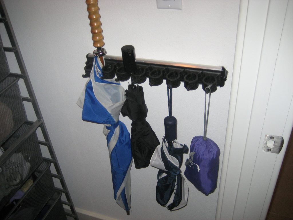 I use it a lot for storing umbrellas. If the umbrella has a strap you can simply hang it on a hook along the front of the Grook. If it doesn’t, you may be able to push the umbrella handle in between the pressure clamps, as shown below.